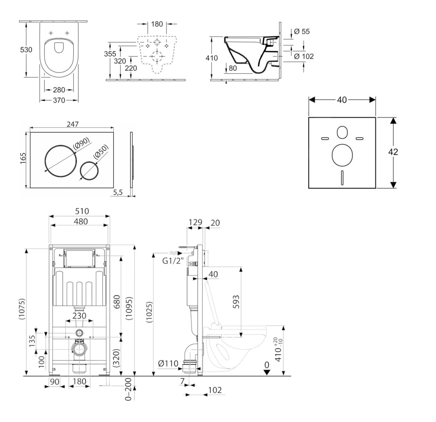 - bevestigingsset voor bevestiging van de toiletpot: 2x draadstang M12, 4x sluitringen, 2x doppen, 2x moeren, 2x draadbeschermer
